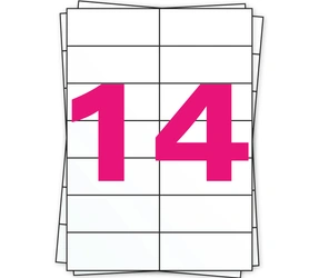 Per ogni foglio ci sono 14 etichette in formato. Queste etichette in formato A4 sono composte da 70gr di carta bianca. Il supporto è di 55gr. Le etichette in formato A4 hanno un forte adesivo permanente e sono composte da carta sbiancata senza cloro. Le etichette in formato A4 sono adatte per stampanti ad inchiostro, stampanti a laser, dispositivi senza fili e fotocopiatrici. Una scatola contiene 100 fogli formato A4. In questo caso la scatola ne contiene 1400. Le etichette in formato A4 con fogli adesivi 105mm x 42mm, queste etichette sono multifunzionali e vengono spesso utilizzate come adesivi per indirizzi.