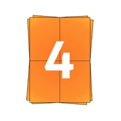 I fogli adesivi A4 arancioni contengono 4 etichette A6 per foglio. Le etichette autoadesive A6 son dotate di una colla permanente e sono in carta sbiancata senza cloro, e possono quindi essere incollate su diverse superfici come carta, cartone e pellicola. Le etichette A6 sono adatte a tutte le stampanti inkjet e laser, così come alle macchine a stampa offset e alle copiatrici. Una scatola contiene 100 fogli di etichette A4, che equivalgono a 400 etichette A6 di colore arancione. Le etichette A6 105x148mm sono spesso usate come etichette di spedizione per DPD, PostNL, TNT, GLS e UPS. Per le dimensioni sono anche chiamate adesivi A6, etichette A6 o tag A6.